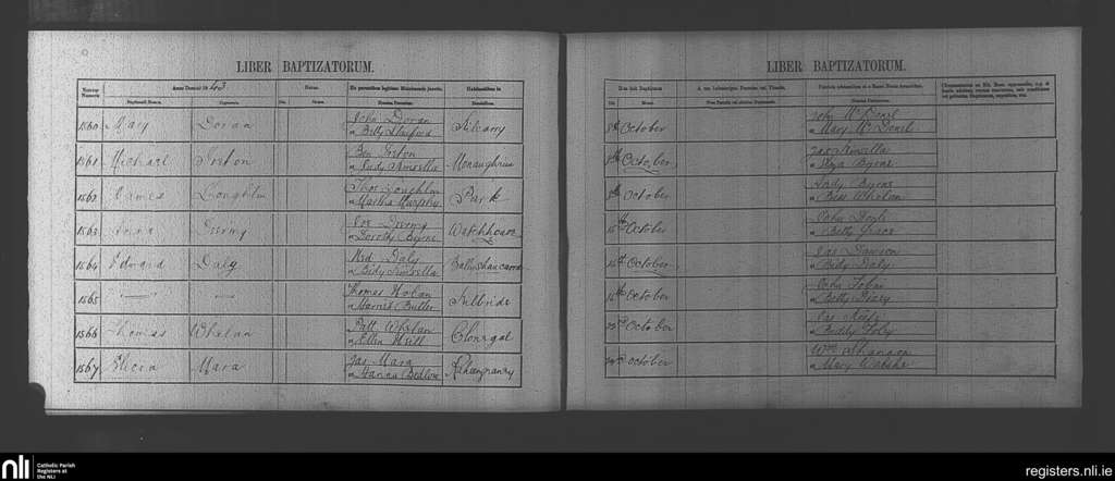 Clonegal; County of Wicklow, Carlow, Wexford; Diocese of Kildare and Leighlin. Baptisms, Oct. 1843