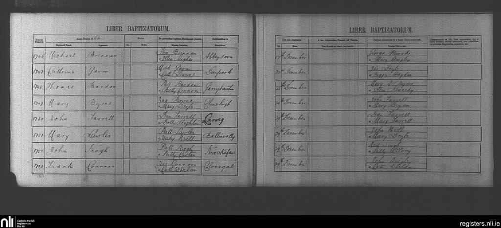 Clonegal; County of Wicklow, Carlow, Wexford; Diocese of Kildare and Leighlin. Baptisms, Dec. 1844