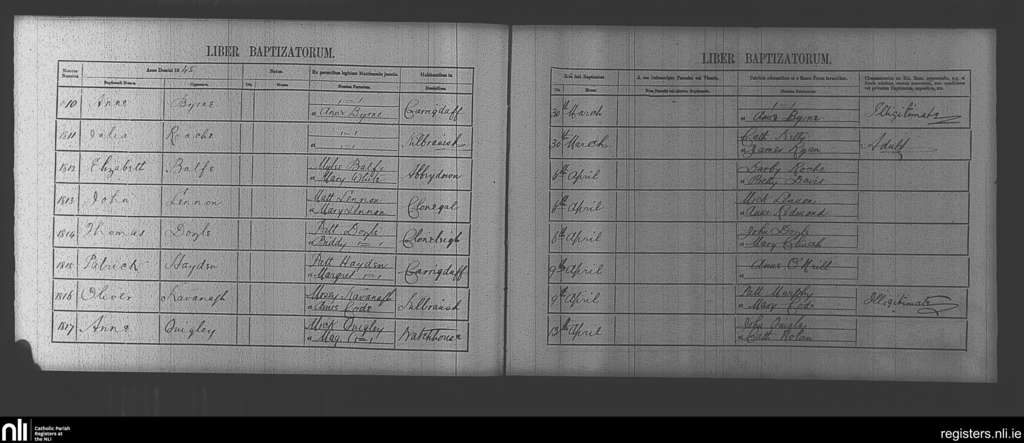 Clonegal; County of Wicklow, Carlow, Wexford; Diocese of Kildare and Leighlin. Baptisms, Mar. 1845 to Apr. 1845