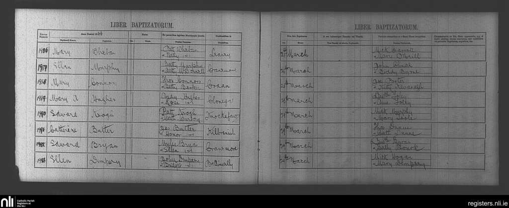 Clonegal; County of Wicklow, Carlow, Wexford; Diocese of Kildare and Leighlin. Baptisms, Mar. 1846