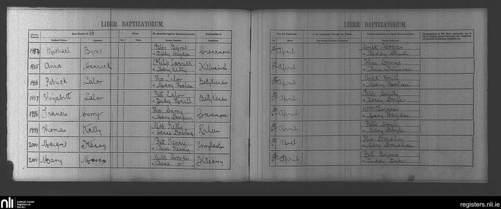 Clonegal; County of Wicklow, Carlow, Wexford; Diocese of Kildare and Leighlin. Baptisms, Apr. 1846