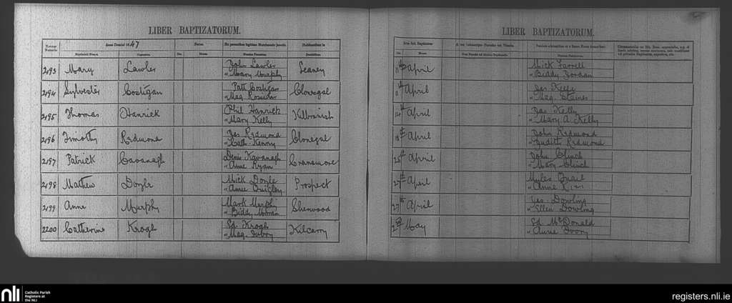 Clonegal; County of Wicklow, Carlow, Wexford; Diocese of Kildare and Leighlin. Baptisms, Apr. 1847 to May 1847