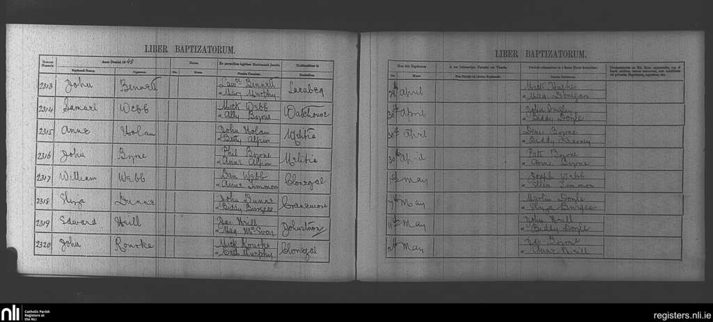Clonegal; County of Wicklow, Carlow, Wexford; Diocese of Kildare and Leighlin. Baptisms, Apr. 1848 to May 1848