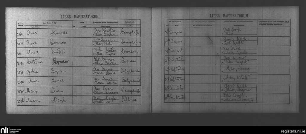 Clonegal; County of Wicklow, Carlow, Wexford; Diocese of Kildare and Leighlin. Baptisms, Aug. 1848 to Sep. 1848