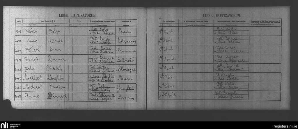 Clonegal; County of Wicklow, Carlow, Wexford; Diocese of Kildare and Leighlin. Baptisms, Apr. 1849