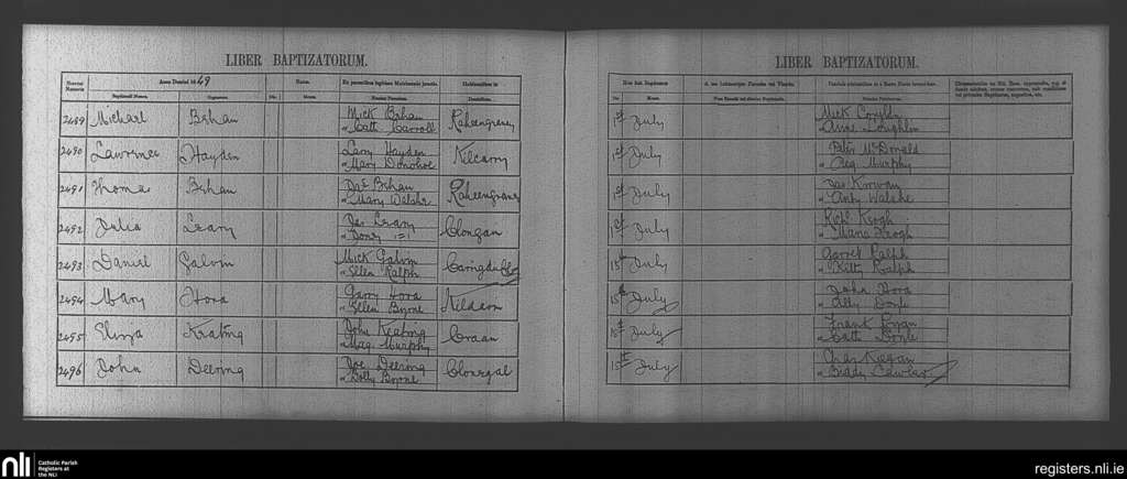 Clonegal; County of Wicklow, Carlow, Wexford; Diocese of Kildare and Leighlin. Baptisms, July 1849