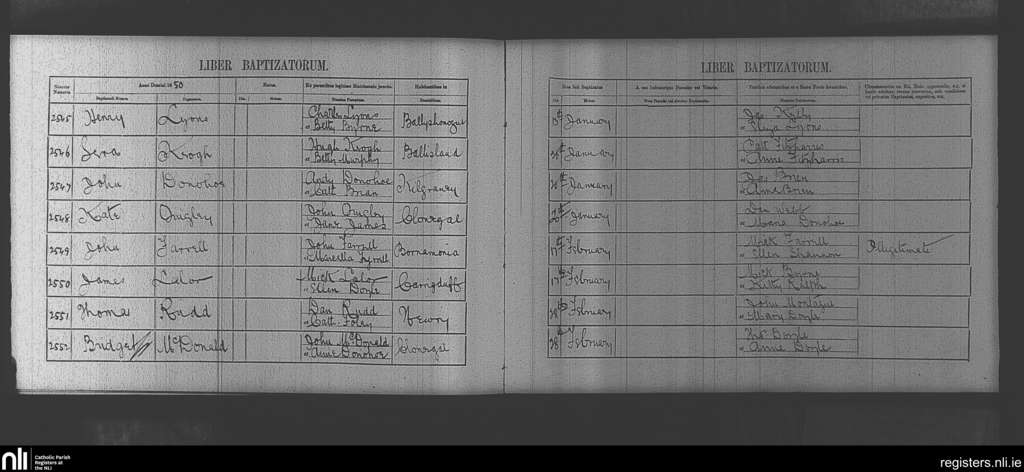 Clonegal; County of Wicklow, Carlow, Wexford; Diocese of Kildare and Leighlin. Baptisms, Jan. 1850 to Feb. 1850