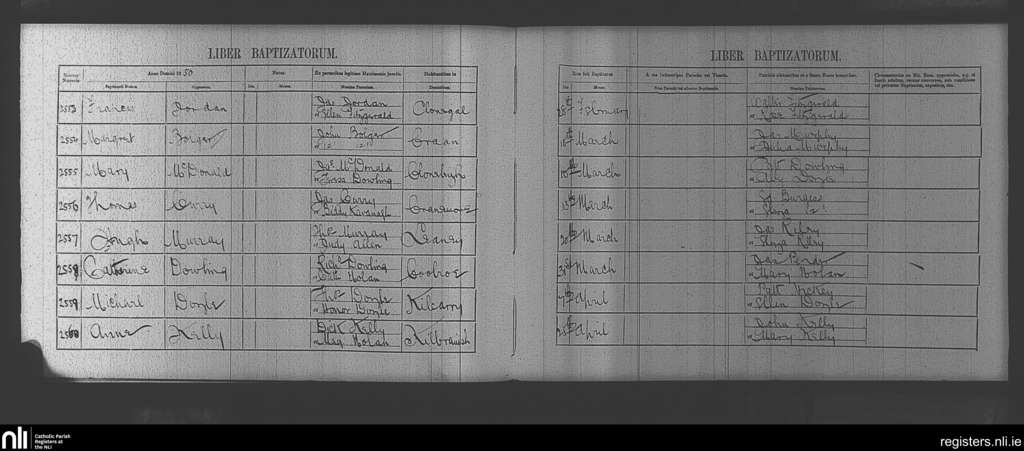 Clonegal; County of Wicklow, Carlow, Wexford; Diocese of Kildare and Leighlin. Baptisms, Feb. 1850 to Apr. 1850
