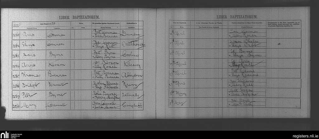 Clonegal; County of Wicklow, Carlow, Wexford; Diocese of Kildare and Leighlin. Baptisms, Apr. 1850 to May 1850