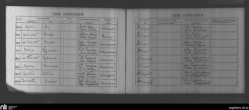 Clonegal; County of Wicklow, Carlow, Wexford; Diocese of Kildare and Leighlin. Baptisms, Aug. 1850