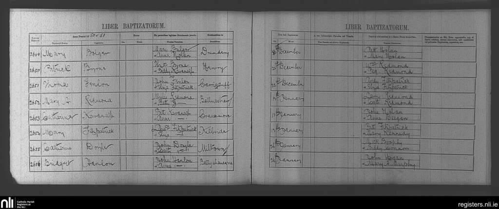 Clonegal; County of Wicklow, Carlow, Wexford; Diocese of Kildare and Leighlin. Baptisms, Dec. 1850 to Jan. 1851