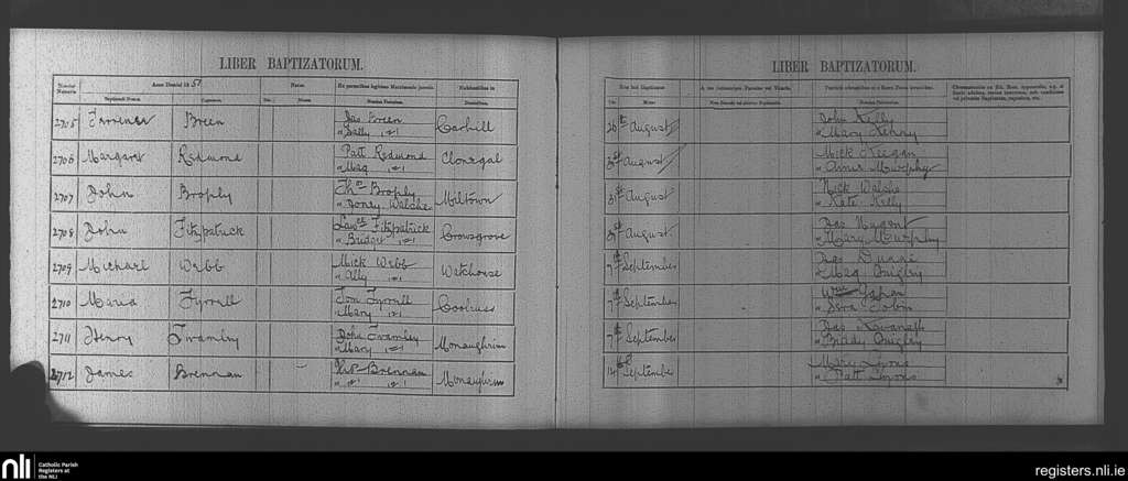 Clonegal; County of Wicklow, Carlow, Wexford; Diocese of Kildare and Leighlin. Baptisms, Aug. 1851 to Sep. 1851