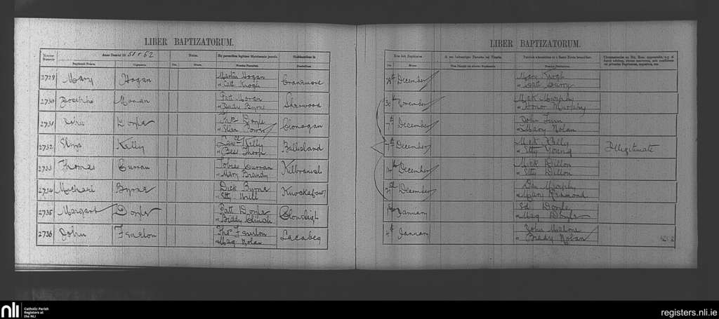 Clonegal; County of Wicklow, Carlow, Wexford; Diocese of Kildare and Leighlin. Baptisms, Nov. 1851 to Jan. 1852