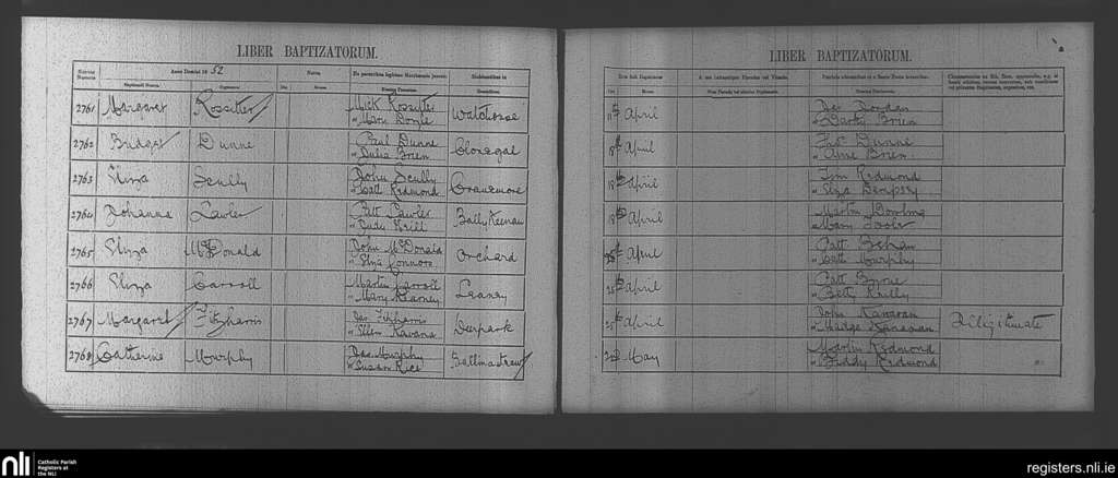 Clonegal; County of Wicklow, Carlow, Wexford; Diocese of Kildare and Leighlin. Baptisms, Apr. 1852 to May 1852