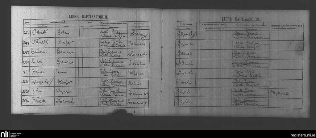 Clonegal; County of Wicklow, Carlow, Wexford; Diocese of Kildare and Leighlin. Baptisms, Mar. 1853 to Apr. 1853