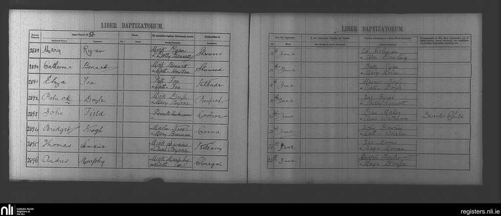 Clonegal; County of Wicklow, Carlow, Wexford; Diocese of Kildare and Leighlin. Baptisms, June 1853