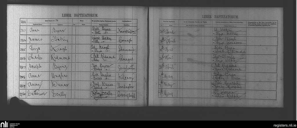 Clonegal; County of Wicklow, Carlow, Wexford; Diocese of Kildare and Leighlin. Baptisms, Apr. 1854 to May 1854