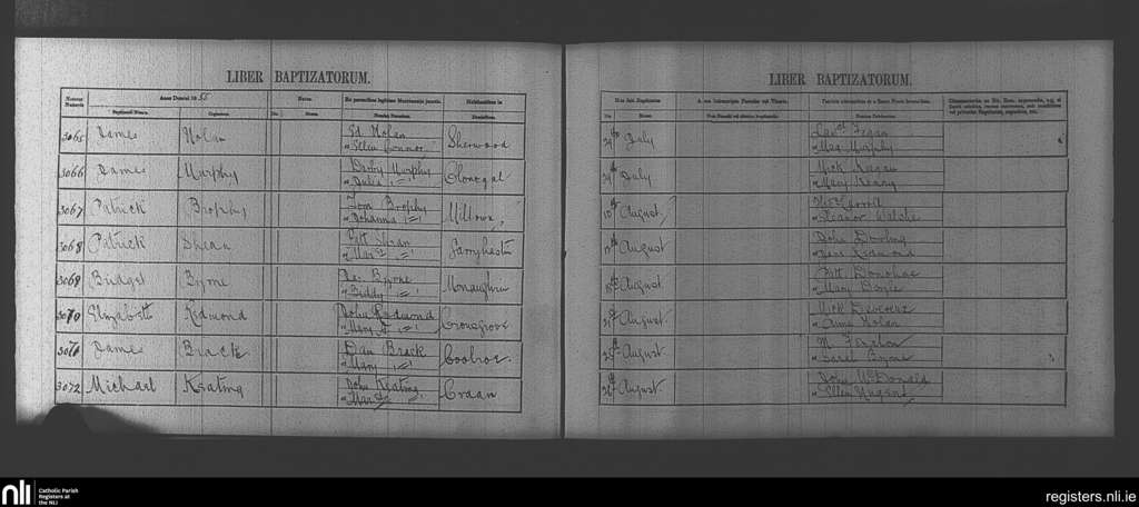 Clonegal; County of Wicklow, Carlow, Wexford; Diocese of Kildare and Leighlin. Baptisms, July 1855 to Aug. 1855