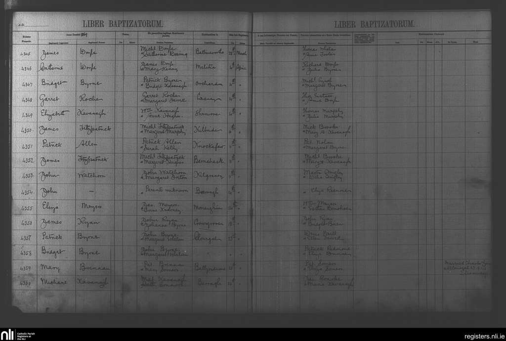 Clonegal; County of Wicklow, Carlow, Wexford; Diocese of Kildare and Leighlin. Baptisms, Mar. 1869 to Apr. 1869