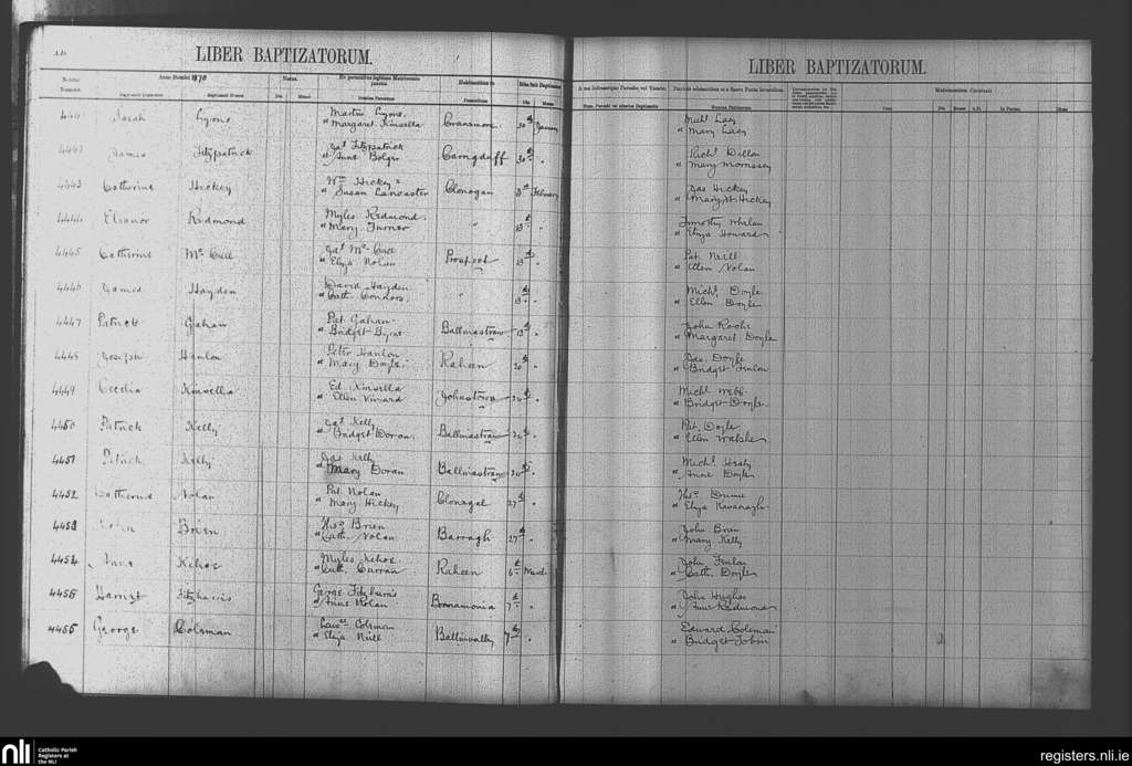 Clonegal; County of Wicklow, Carlow, Wexford; Diocese of Kildare and Leighlin. Baptisms, Jan. 1870 to Mar. 1870