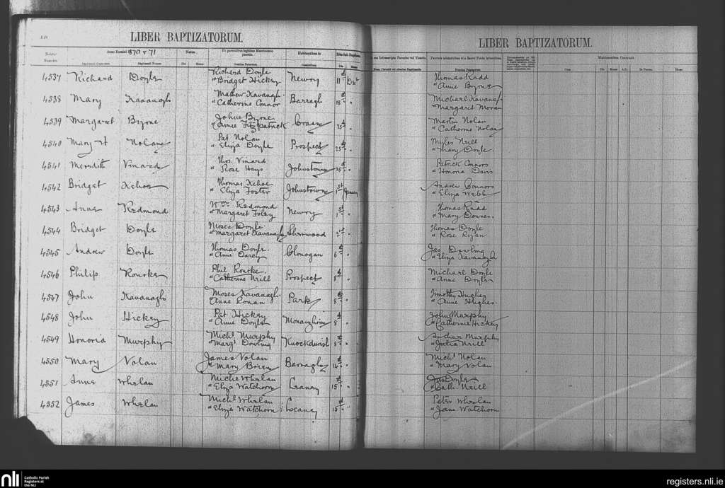 Clonegal; County of Wicklow, Carlow, Wexford; Diocese of Kildare and Leighlin. Baptisms, Dec. 1870 to Jan. 1871