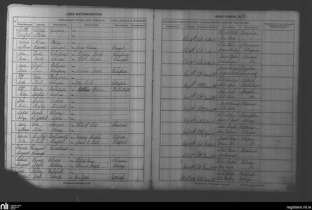 Clonegal; County of Wicklow, Carlow, Wexford; Diocese of Kildare and Leighlin. Marriages, Feb. 1872 to Feb. 1873