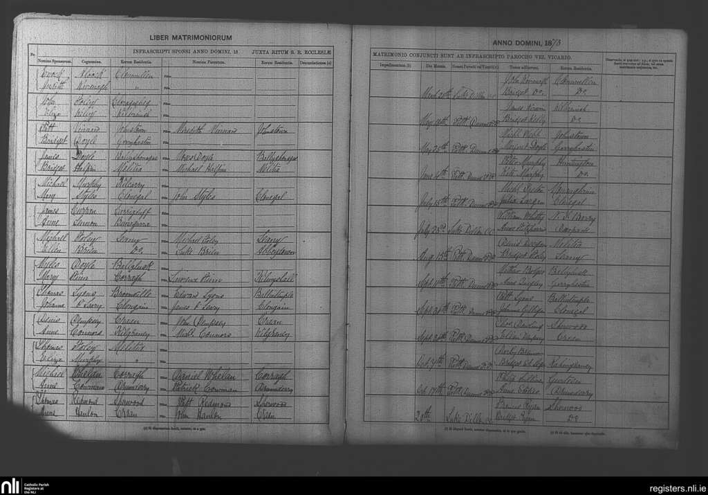 Clonegal; County of Wicklow, Carlow, Wexford; Diocese of Kildare and Leighlin. Marriages, Mar. 1873 to Oct. 1873