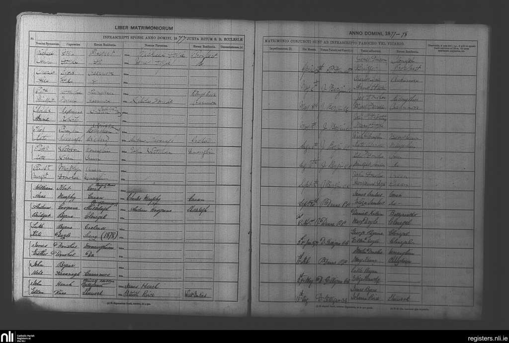 Clonegal; County of Wicklow, Carlow, Wexford; Diocese of Kildare and Leighlin. Marriages, Apr. 1877 to Aug. 1878