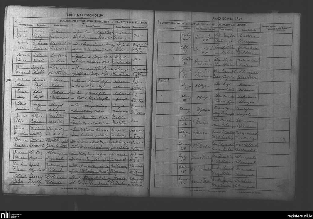 Clonegal; County of Wicklow, Carlow, Wexford; Diocese of Kildare and Leighlin. Marriages, July 1880 to Nov. 1881