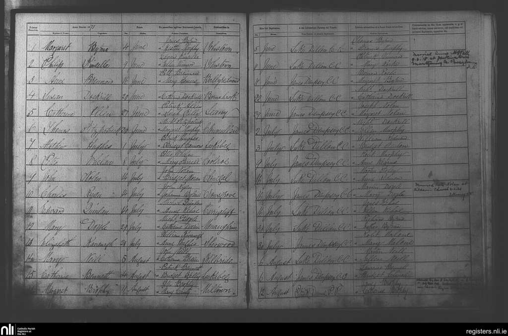 Clonegal; County of Wicklow, Carlow, Wexford; Diocese of Kildare and Leighlin. Baptisms, June 1871 to Aug. 1871