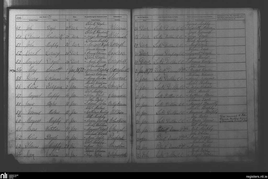 Clonegal; County of Wicklow, Carlow, Wexford; Diocese of Kildare and Leighlin. Baptisms, Dec. 1871 to Feb. 1872