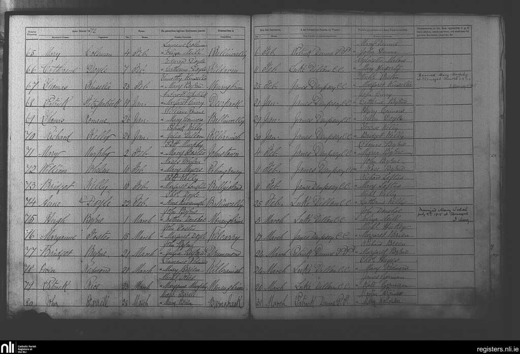 Clonegal; County of Wicklow, Carlow, Wexford; Diocese of Kildare and Leighlin. Baptisms, Jan. 1872 to Mar. 1872