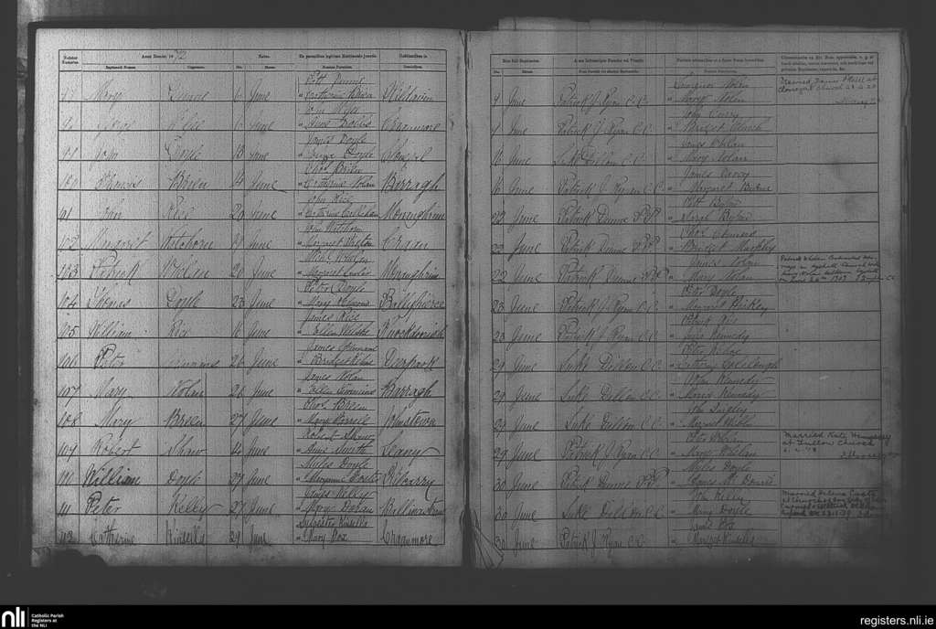 Clonegal; County of Wicklow, Carlow, Wexford; Diocese of Kildare and Leighlin. Baptisms, June 1872