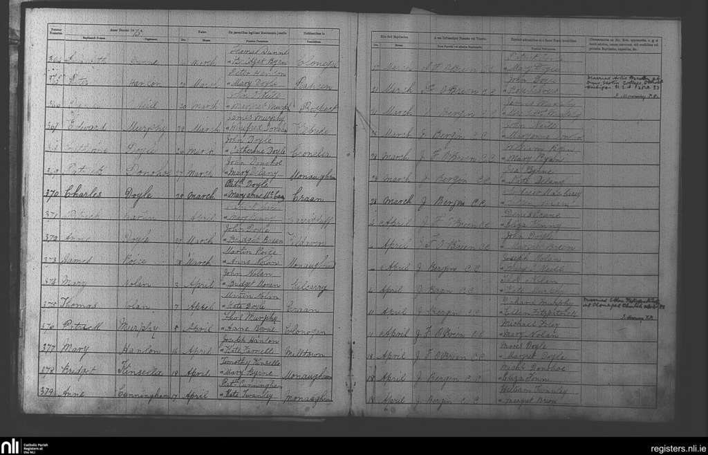 Clonegal; County of Wicklow, Carlow, Wexford; Diocese of Kildare and Leighlin. Baptisms, Mar. 1875 to Apr. 1875
