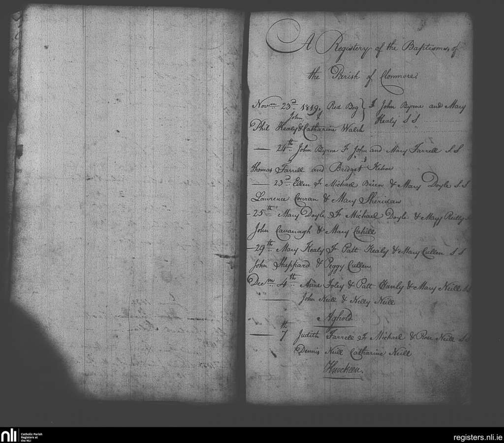 Clonmore; County of Wicklow, Carlow; Diocese of Kildare and Leighlin. Baptisms, Nov. 1819 to Dec. 1819
