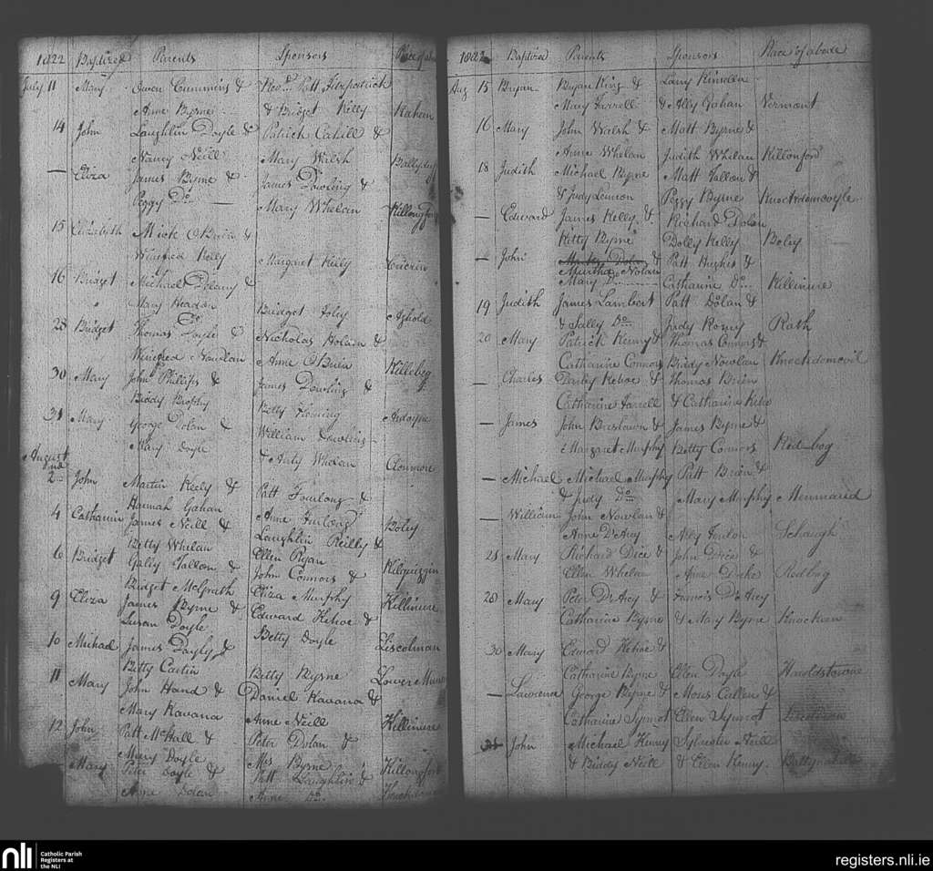 Clonmore; County of Wicklow, Carlow; Diocese of Kildare and Leighlin. Baptisms, July 1822 to Aug. 1822
