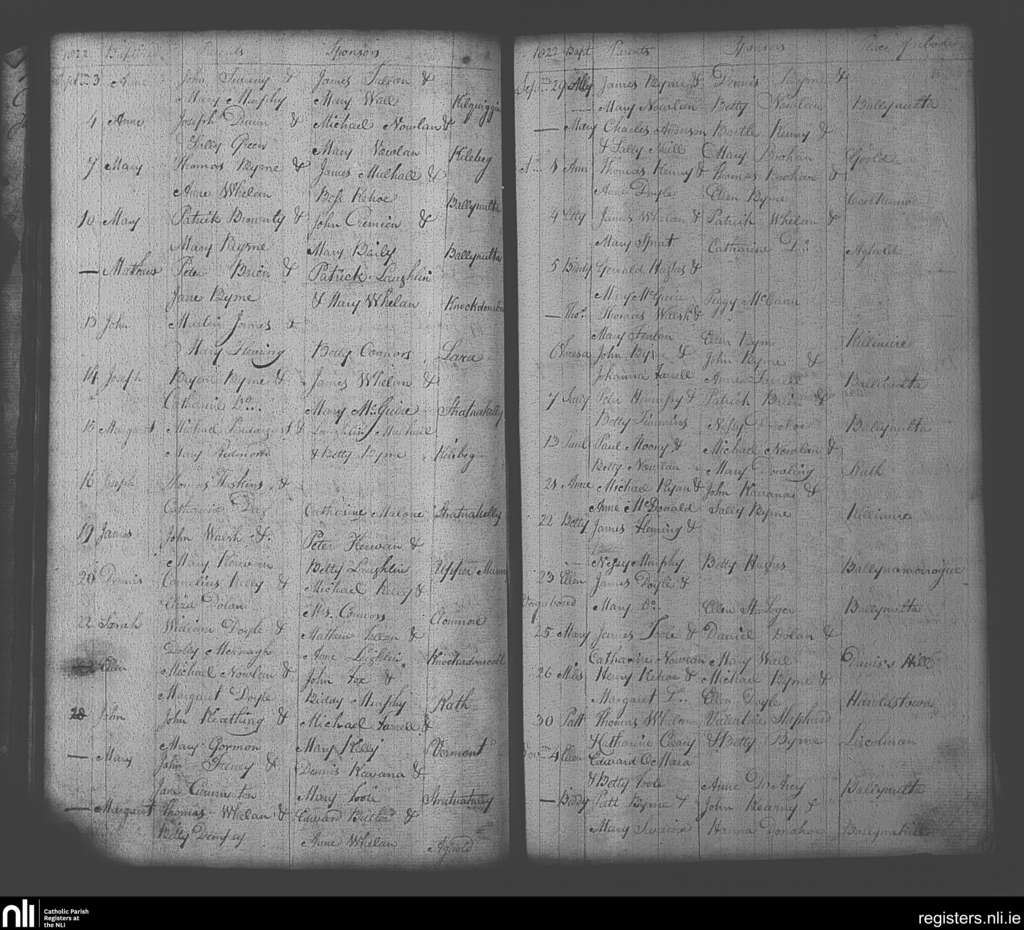 Clonmore; County of Wicklow, Carlow; Diocese of Kildare and Leighlin. Baptisms, Sep. 1822 to Nov. 1822