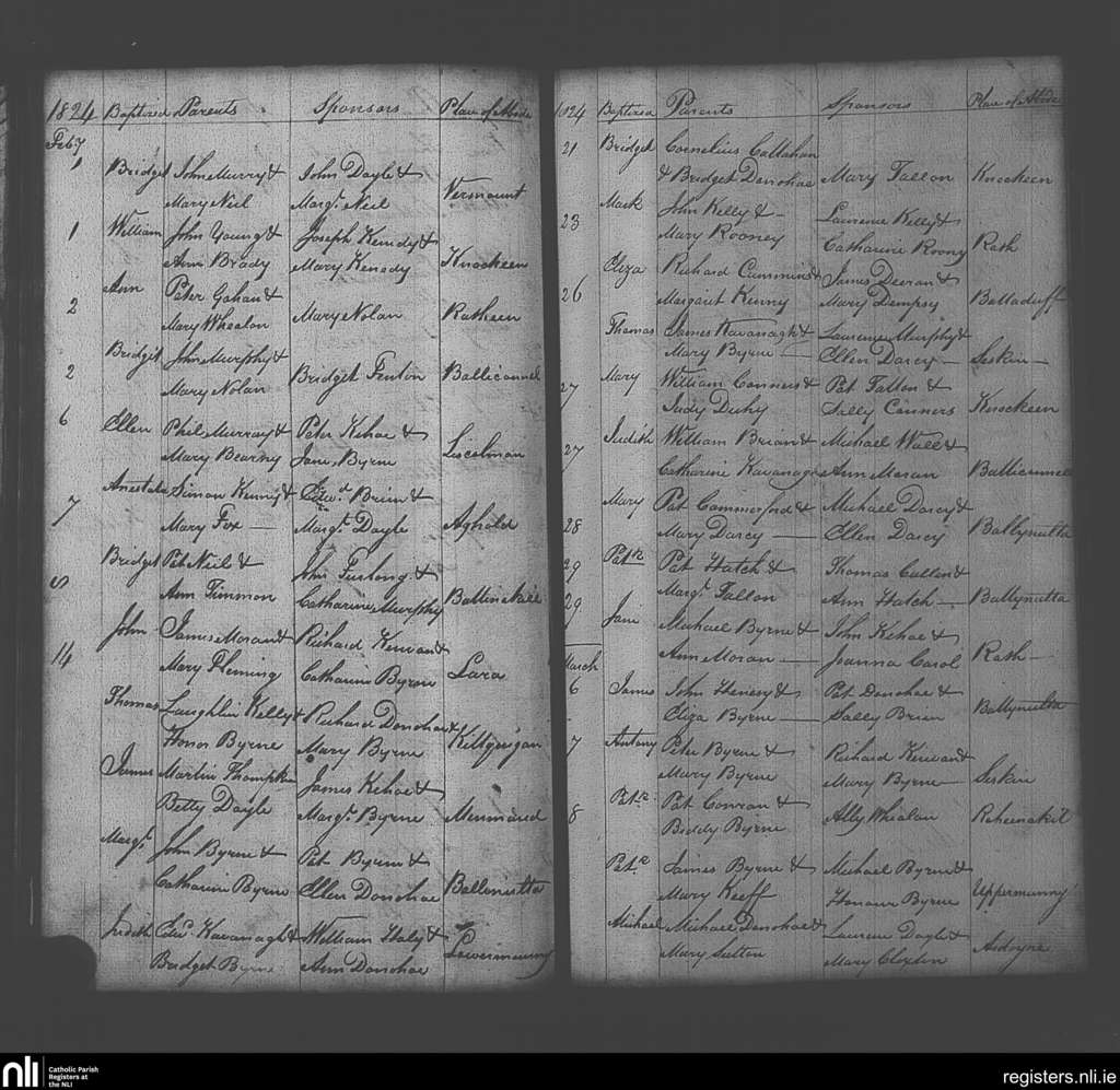 Clonmore; County of Wicklow, Carlow; Diocese of Kildare and Leighlin. Baptisms, Feb. 1824 to Mar. 1824