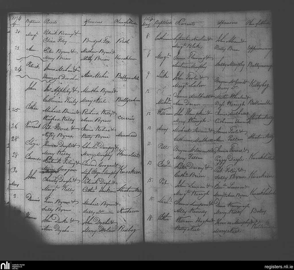 Clonmore; County of Wicklow, Carlow; Diocese of Kildare and Leighlin. Baptisms, Apr. 1824 to May 1824