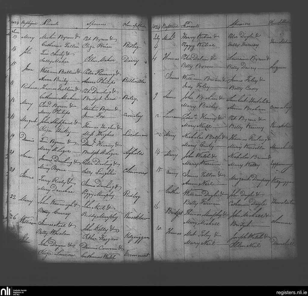 Clonmore; County of Wicklow, Carlow; Diocese of Kildare and Leighlin. Baptisms, June 1824 to July 1824