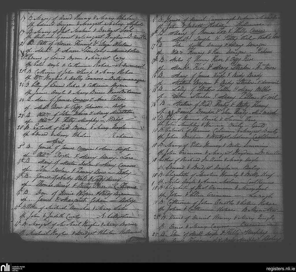 Clonmore; County of Wicklow, Carlow; Diocese of Kildare and Leighlin. Baptisms, Mar. 1830 to Apr. 1830