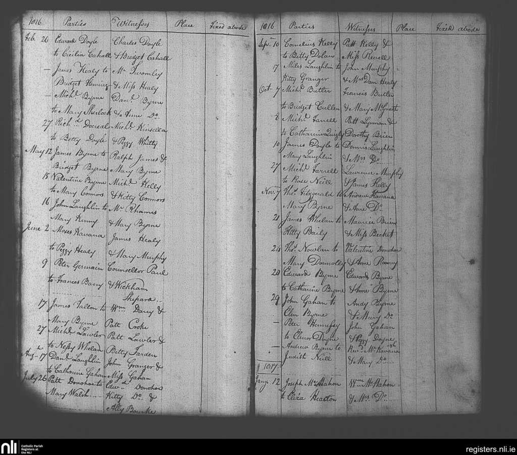 Clonmore; County of Wicklow, Carlow; Diocese of Kildare and Leighlin. Marriages, Feb. 1816 to Jan. 1817