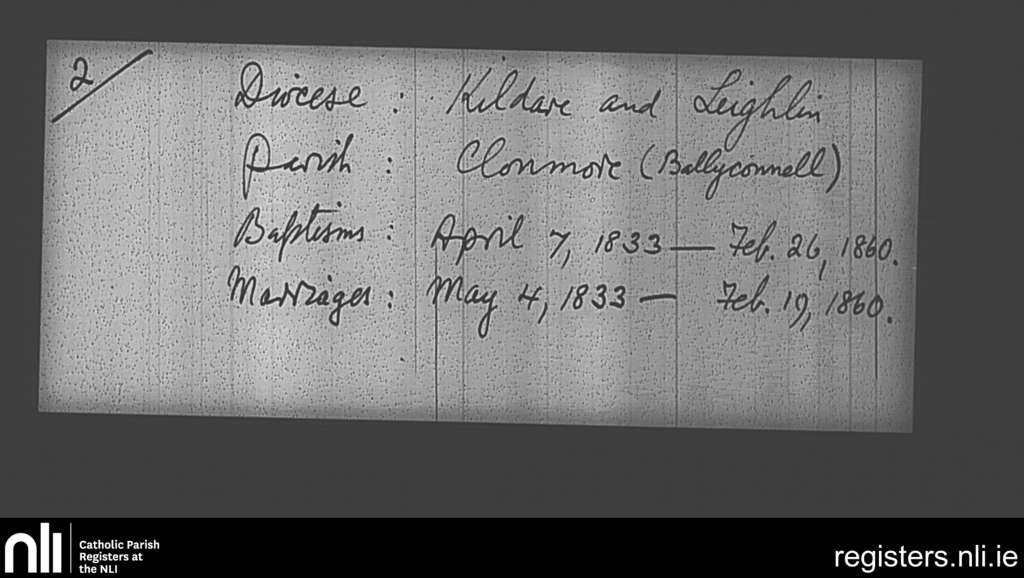 Clonmore; County of Carlow, Wicklow; Diocese of Kildare and Leighlin. Baptisms, Marriages