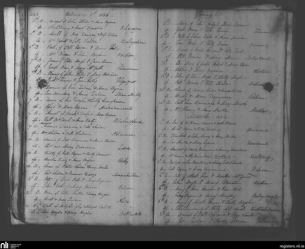Clonmore; County of Carlow, Wicklow; Diocese of Kildare and Leighlin. Baptisms, Feb. 1836 to Mar. 1836