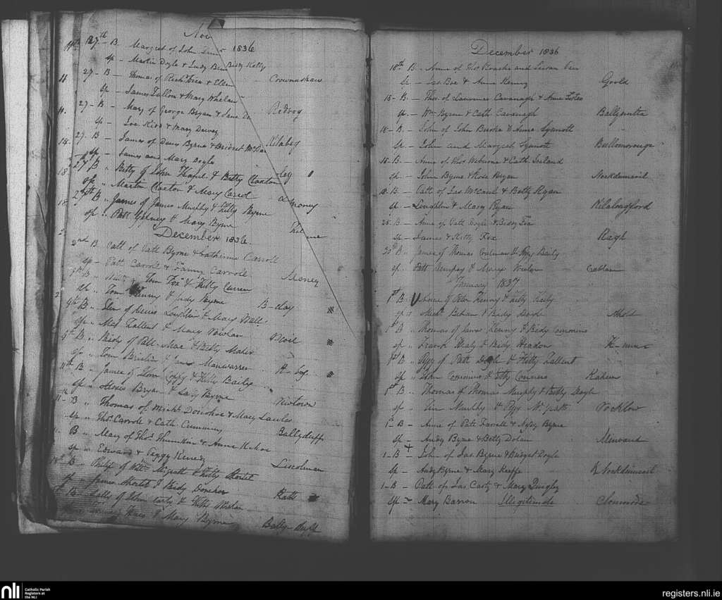 Clonmore; County of Carlow, Wicklow; Diocese of Kildare and Leighlin. Baptisms, Nov. 1836 to Jan. 1837