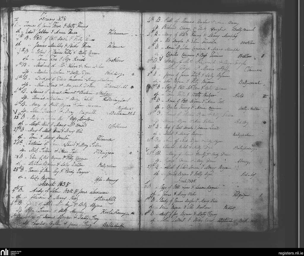 Clonmore; County of Carlow, Wicklow; Diocese of Kildare and Leighlin. Baptisms, Feb. 1838 to Apr. 1838
