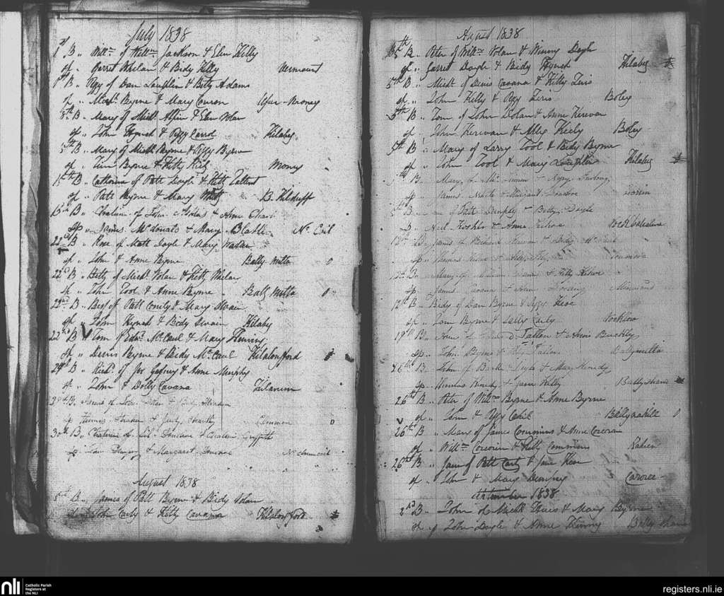 Clonmore; County of Carlow, Wicklow; Diocese of Kildare and Leighlin. Baptisms, July 1838 to Sep. 1838