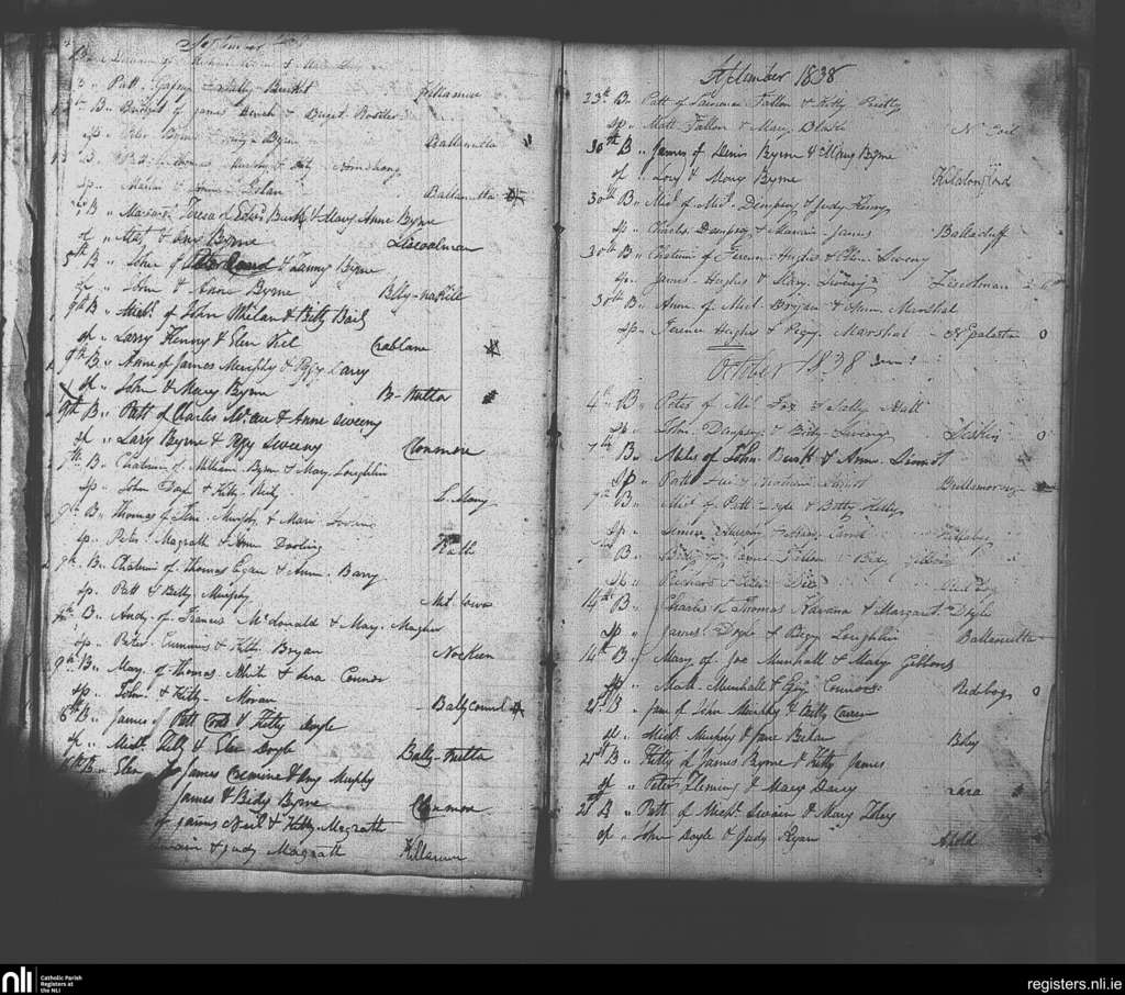 Clonmore; County of Carlow, Wicklow; Diocese of Kildare and Leighlin. Baptisms, Sep. 1838 to Oct. 1838