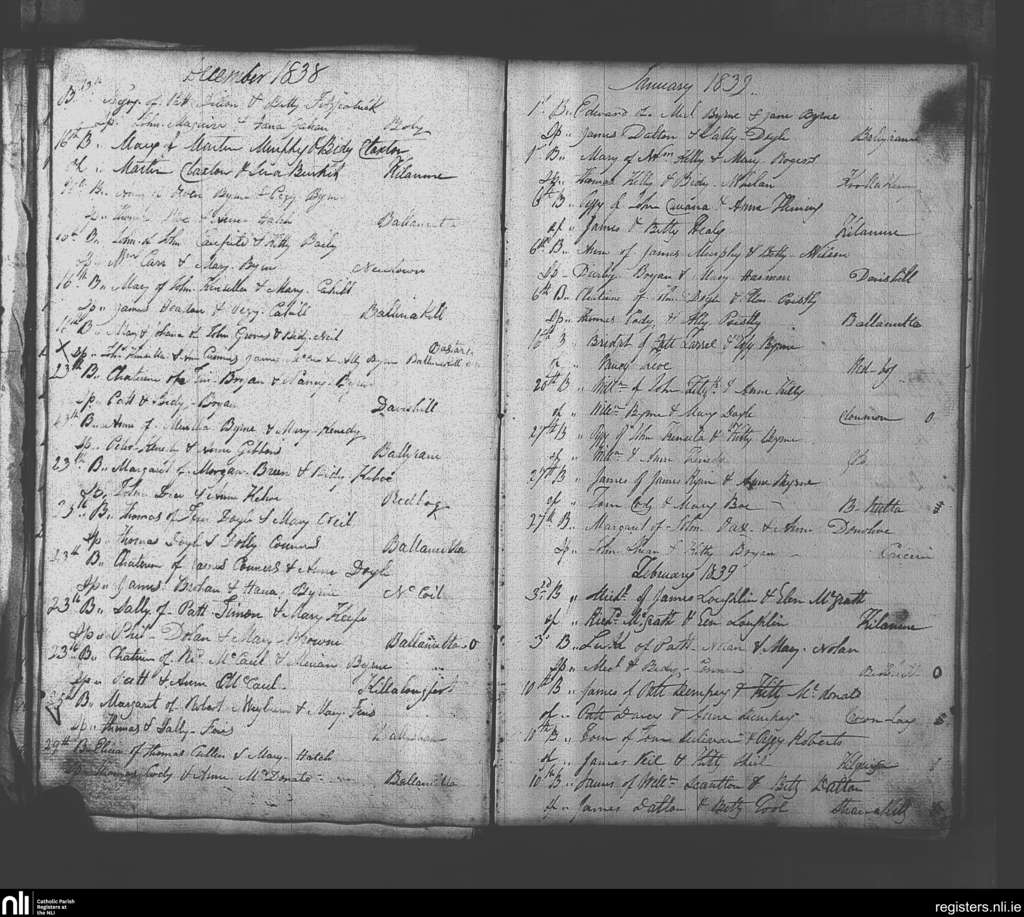 Clonmore; County of Carlow, Wicklow; Diocese of Kildare and Leighlin. Baptisms, Dec. 1838 to Feb. 1839