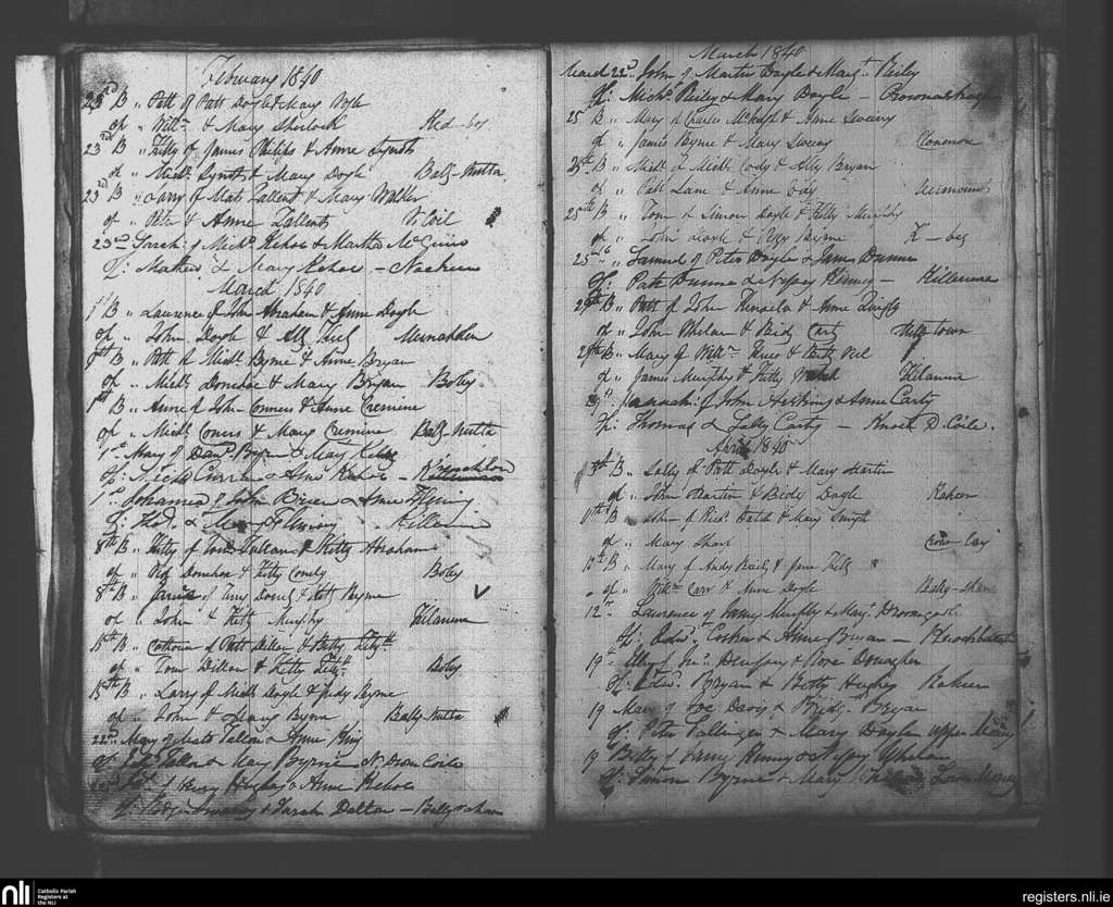 Clonmore; County of Carlow, Wicklow; Diocese of Kildare and Leighlin. Baptisms, Feb. 1840 to Apr. 1840